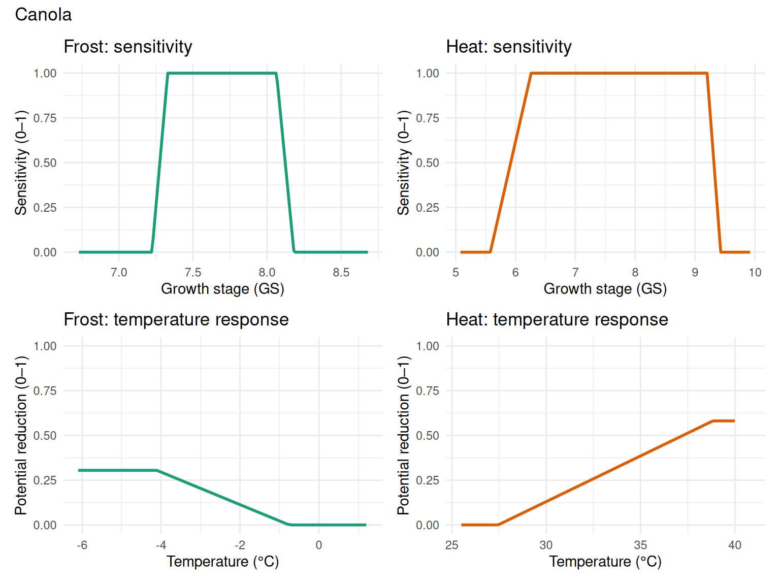 The figures below illustrate the temperature response and growth stage sensitivity functions for frost and heat damage for both wheat and canola crops using the default parameters.