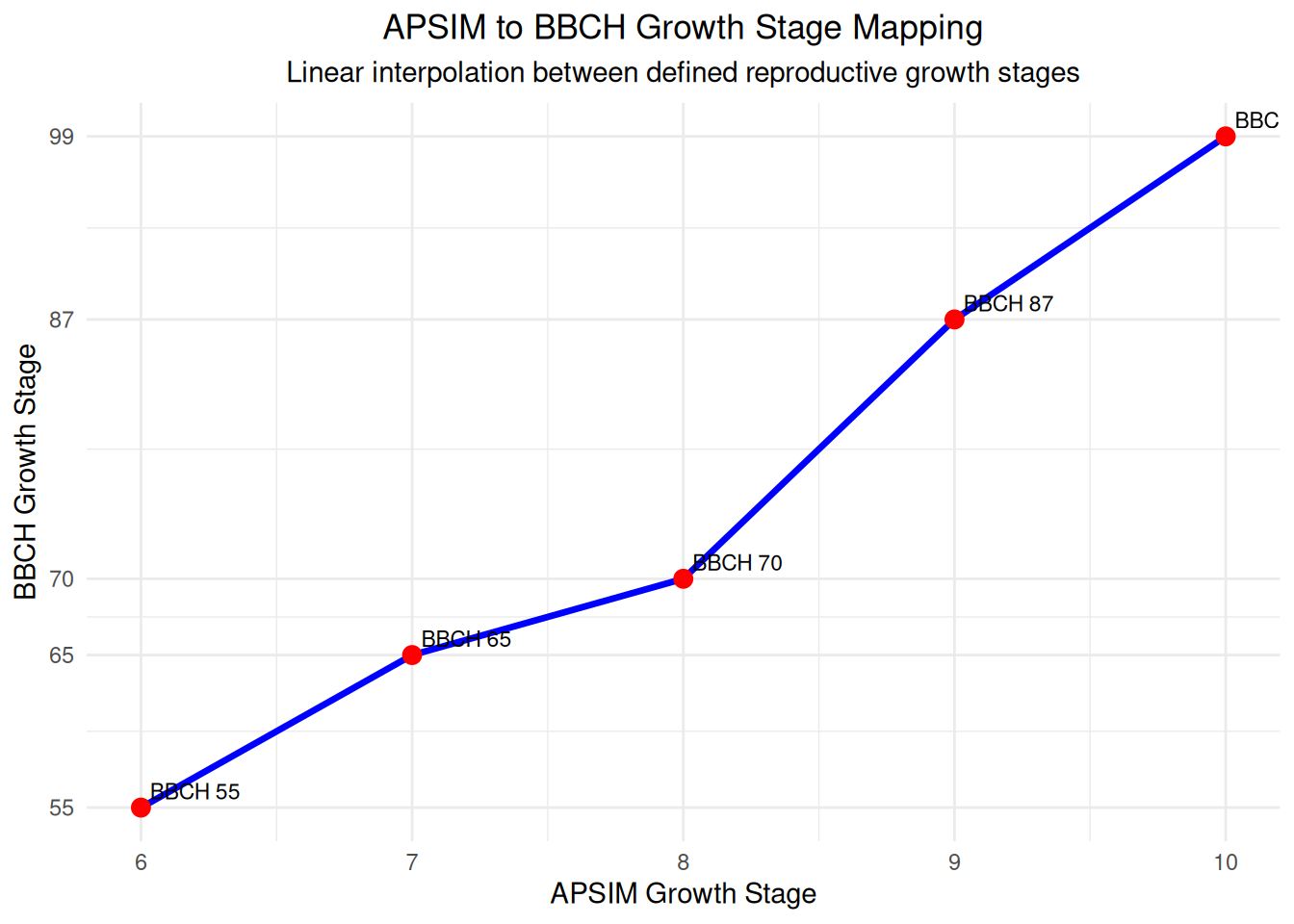 A phenological staging system that converts APSIM-NG’s internal growth stages into standardized BBCH (Biologische Bundesanstalt, Bundessortenamt und CHemische Industrie) growth stages for cereals (Meier 2001), providing internationally recognized developmental benchmarks for agricultural research and management.