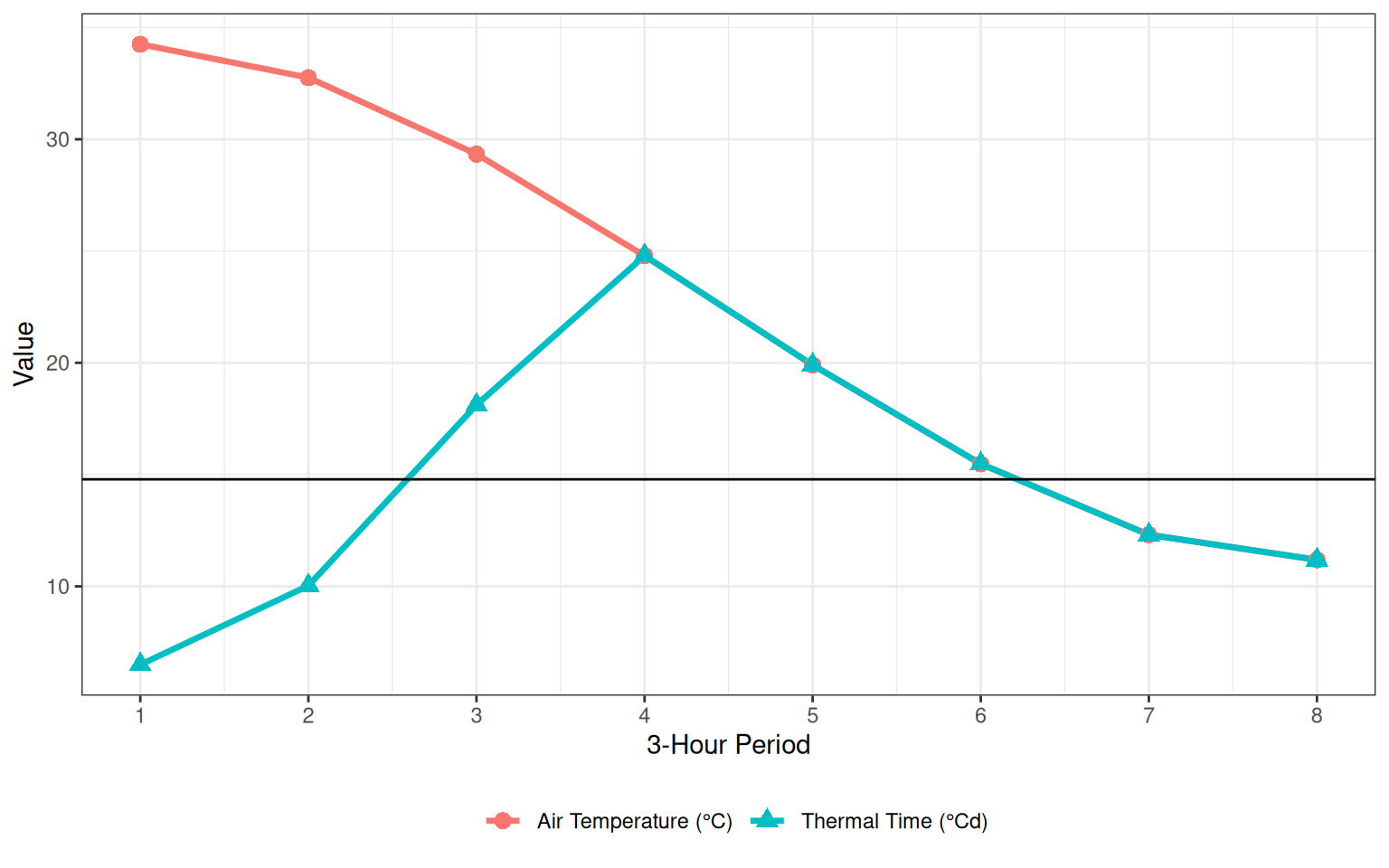 | 3-Hour Period | Temperature (°C) | Thermal Time (°Cd) |