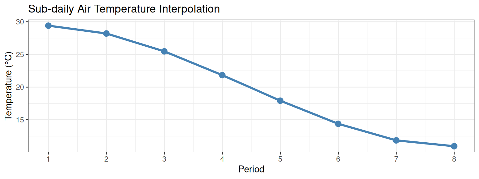 Daily thermal time is calculated using sub-daily interpolation with three-hourly thermal time values. Air temperature is interpolated from daily maximum and minimum using the three-hourly air temperature interpolation method, and the thermal time response is applied at each three-hour interval, then aggregated to give the daily total: