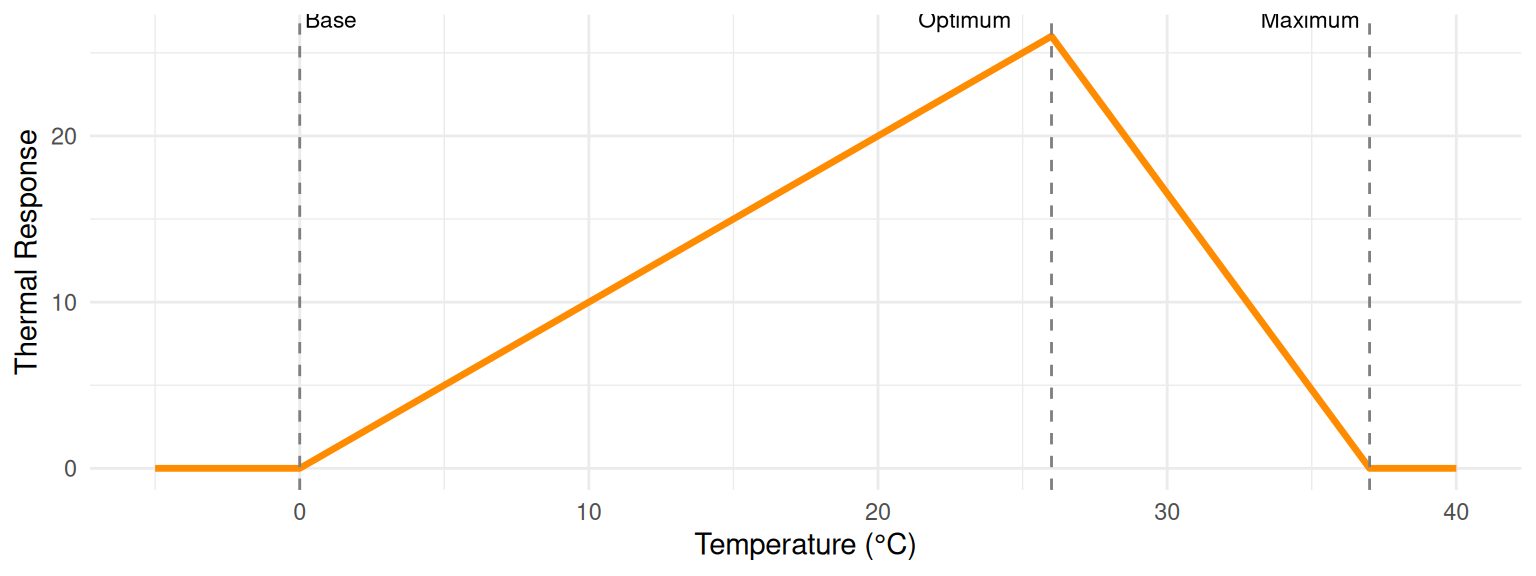 The thermal time response to air temperature (\(T\)) follows a three-cardinal-temperature model (0°C (base), 26°C (optimum), and 37°C (maximum)):