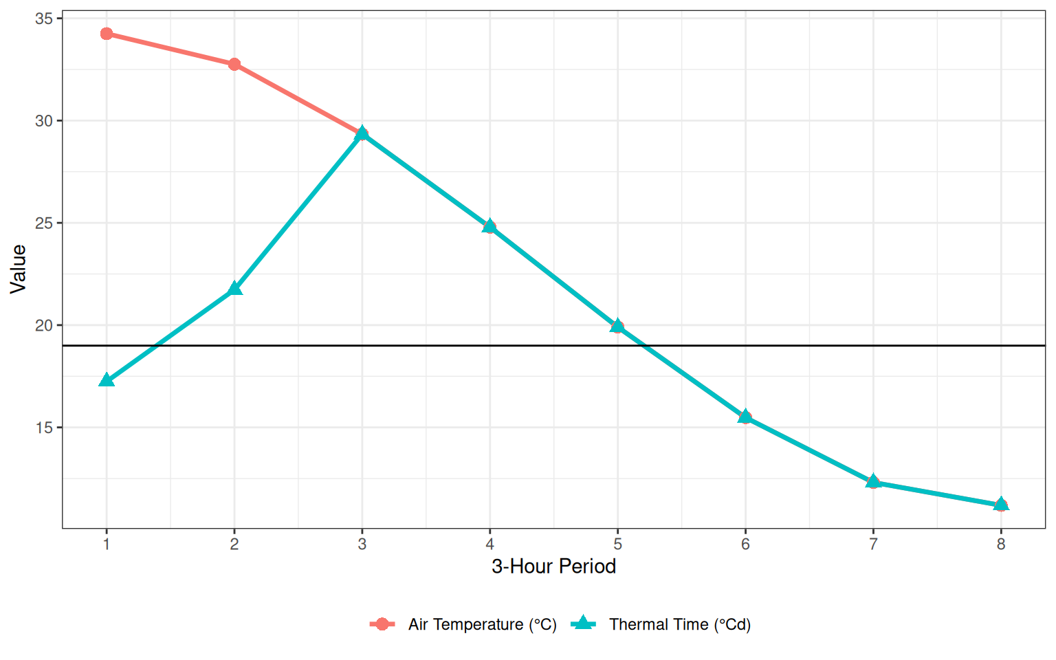 | 3-Hour Period | Temperature (°C) | Thermal Time (°Cd) |