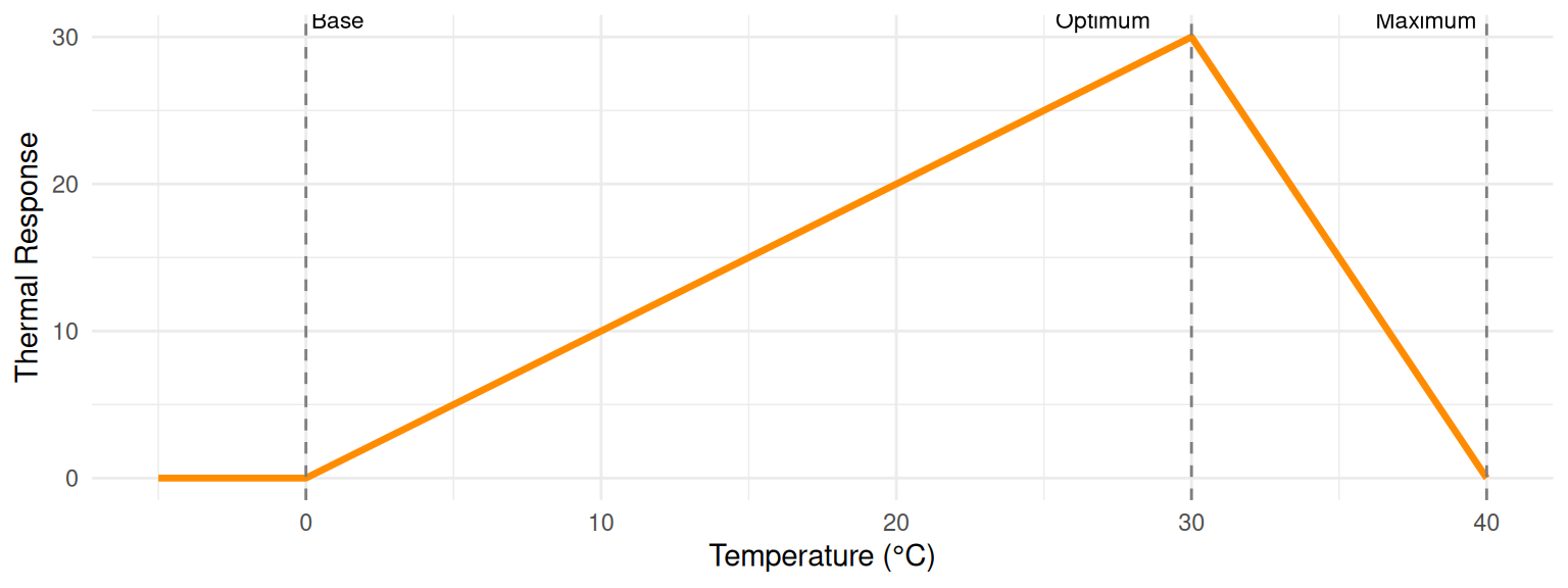 The thermal time response to air temperature (\(T\)) follows a three-cardinal-temperature model (0°C (base), 30°C (optimum), and 40°C (maximum)):