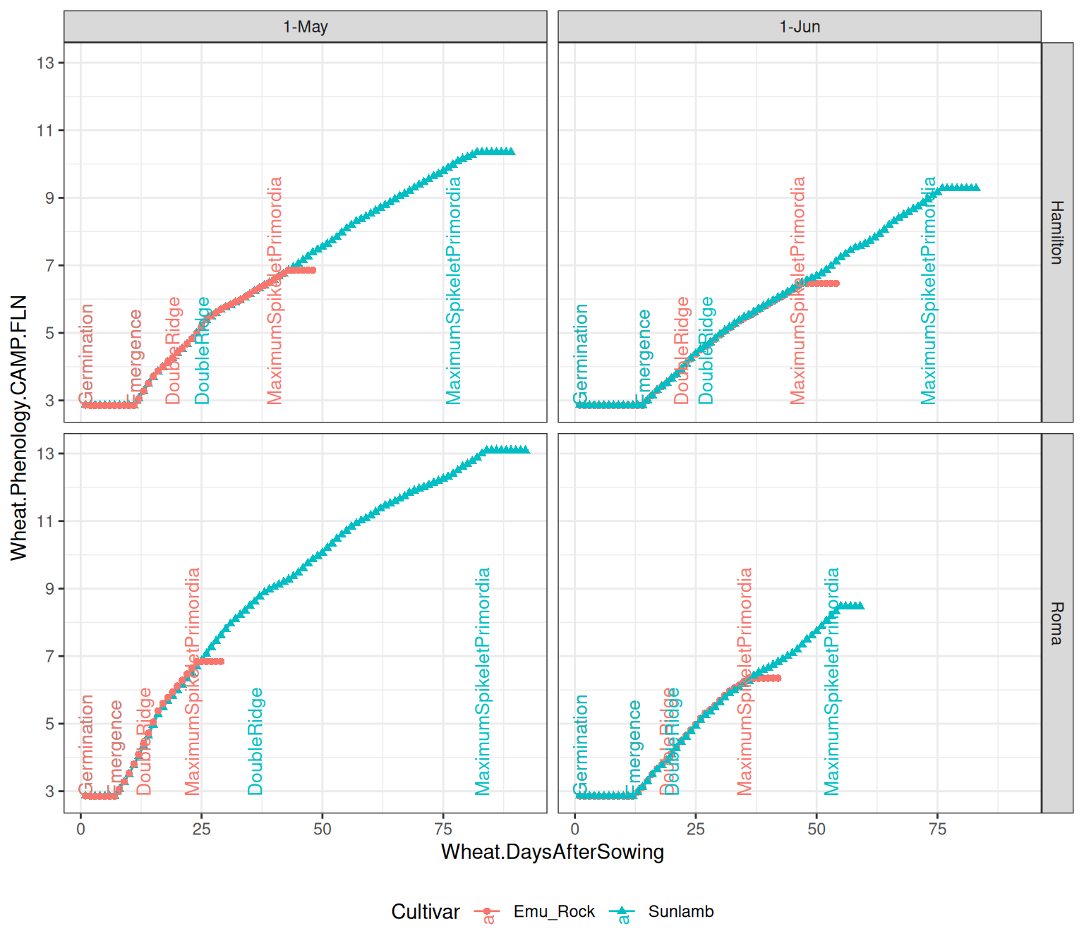 Two cultivars, Emu_Rock and Sunlamb, are used in the example simulations to represent the very quick and very late maturity types, respectively (Celestina et al. 2023). The following table shows the FLN parameters for these two cultivars: