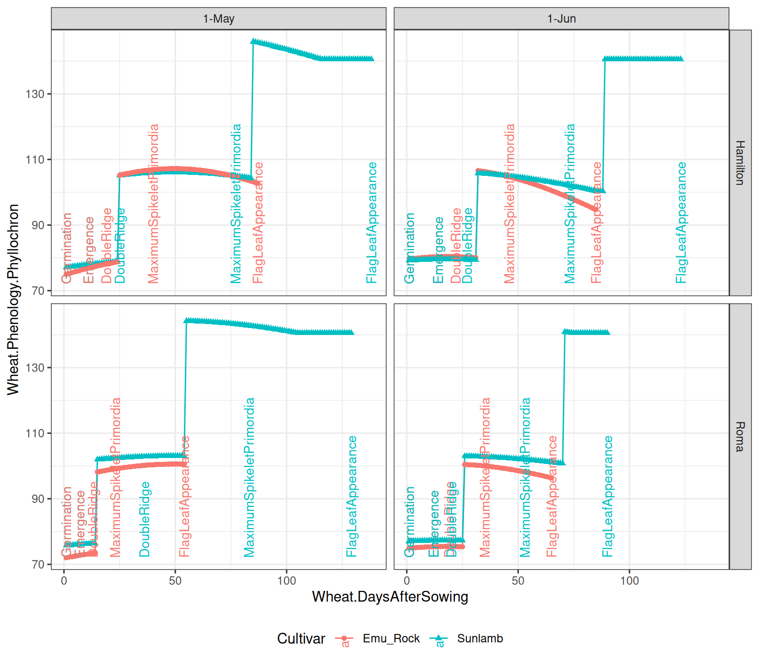 Two cultivars, Emu_Rock and Sunlamb, are used in the example simulations to represent the very quick and very late maturity types, respectively (Celestina et al. 2023).