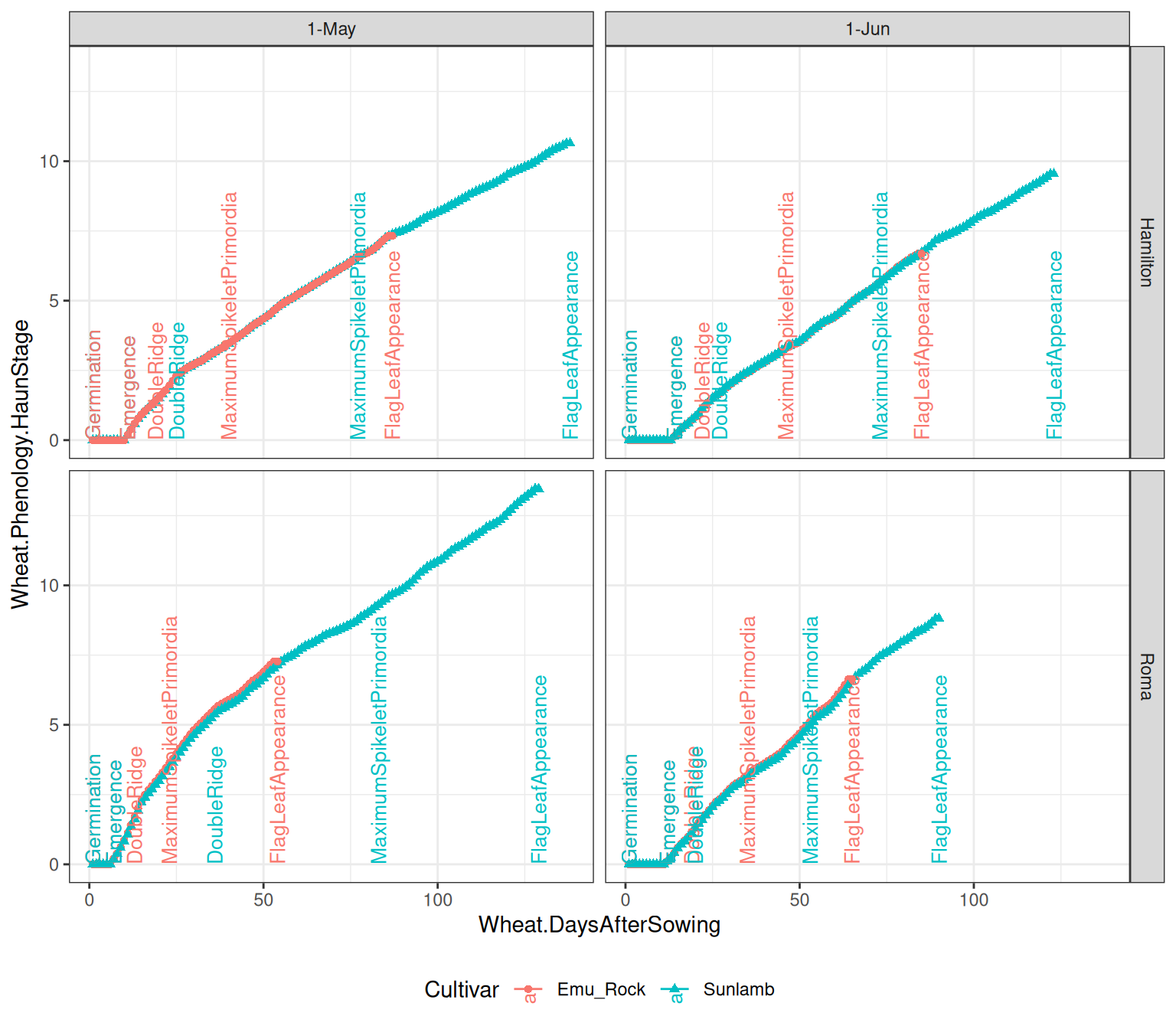 Two cultivars, Emu_Rock and Sunlamb, are used in the example simulations to represent the very quick and very late maturity types, respectively (Celestina et al. 2023). Both cultivars have the similar base phyllochron values, resulting in similar Haun Stage.