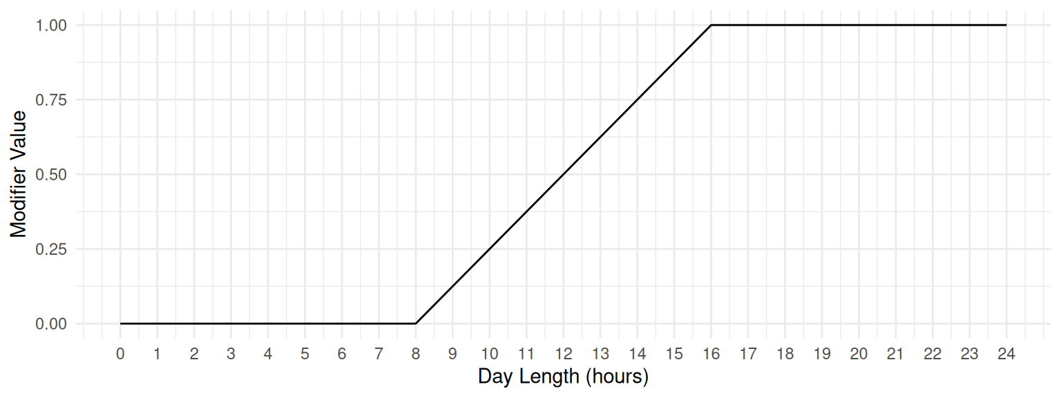 The internal function calcCAMPVrnRates is used to calculate the Vrn1, Vrn2, and Vrn3 rates based on the above parameters. It only requires an external parameter Base Phyllochron which is defined as the thermal time required for each new leaf to appear under standard conditions with a default value of 120 °C·days.