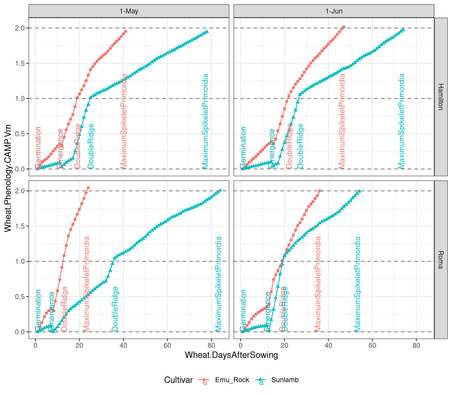 Two cultivars, Emu_Rock and Sunlamb, are used in the example simulations to represent the very quick and very late maturity types, respectively (Celestina et al. 2023). The following table shows the FLN parameters for these two cultivars: